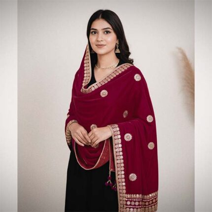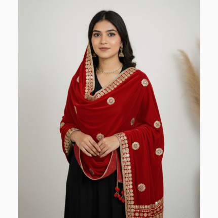 Add a touch of royal elegance to your ethnic wardrobe with the ARIPAN Velvet Heavy Cherry Border Dupatta/Chunni. Crafted from premium-quality velvet, this dupatta features a rich cherry-colored heavy border adorned with intricate trending gotapatti embroidery, giving it a luxurious and traditional appeal. The fine craftsmanship and classy design make it perfect for weddings, festive occasions, parties, and cultural celebrations.